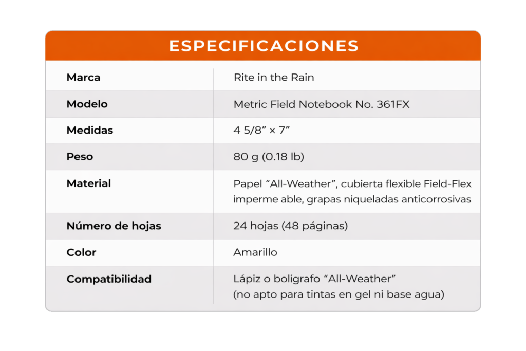 La Libreta de Campo Rite in the Rain No. 361FX es una libreta métrica ligera y resistente, diseñada para trabajos técnicos en condiciones extremas. Su papel “All-Weather” y cubierta flexible Field-Flex impermeable permiten escribir bajo lluvia, sudor, grasa, aceite o barro sin comprometer las anotaciones. Con encuadernación lateral con grapas niqueladas anticorrosivas, 24 hojas (48 páginas) y formato métrico preciso, es ideal para ingenieros, técnicos y geólogos que requieren durabilidad y confiabilidad en campo.